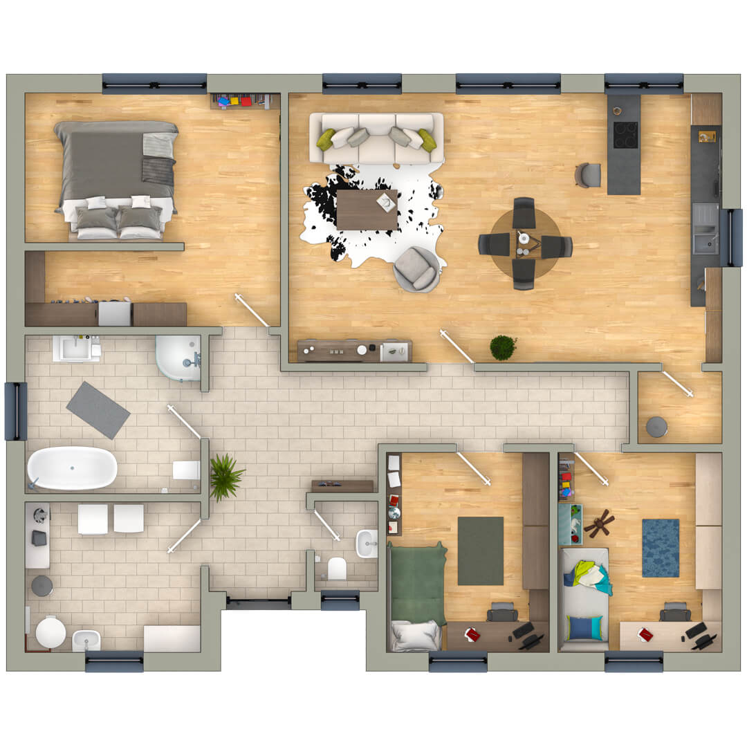 Der moderne Bungalow mit großen Fenstern und bodentiefen Glastüren zum Garten, spart nicht an Vorzügen. Über einen überdachten Eingangsbereich gelangt man in den großzügigen Flurbereich. Von hier aus sind alle Zimmer barrierefrei erreichbar und dennoch so separiert, dass die Privatsphäre für alle Familienmitglieder sichergestellt wird.
