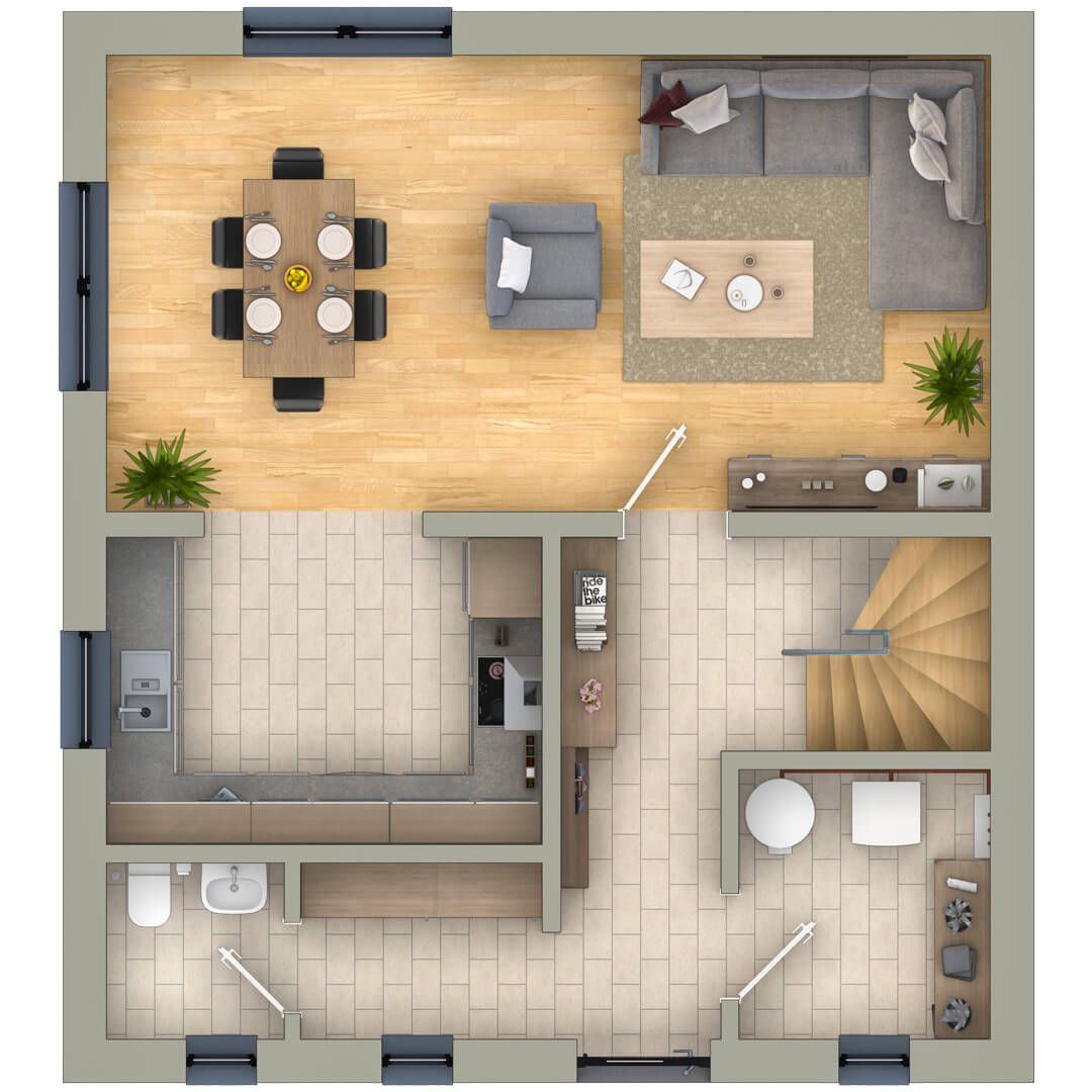 Im Erdgeschoss fallen besonders die zwei großen Fensterbereiche, wahlweise mit Doppelschiebetüren, ins Auge. Diese sind so angelegt, dass sie den Wohnbereich perfekt mit Tageslicht versorgen. Zugleich erhellen sie auch die Küche, die in diesem Grundriss eine Kombination aus geschlossenem Bereich und offener Küche ist.