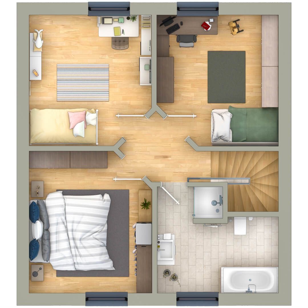 Alle Schlafräume im Obergeschoss haben in etwa die gleiche Größe und denselben Schnitt. Dieser ergibt sich vor allem durch den diagonal platzierten Flurbereich. Er ist nur so groß, dass man alle Zimmer dieser Etage bequem erreicht. In jedem der Schlafzimmer sorgt ein großes Fenster in der Hauswand für viel Licht.